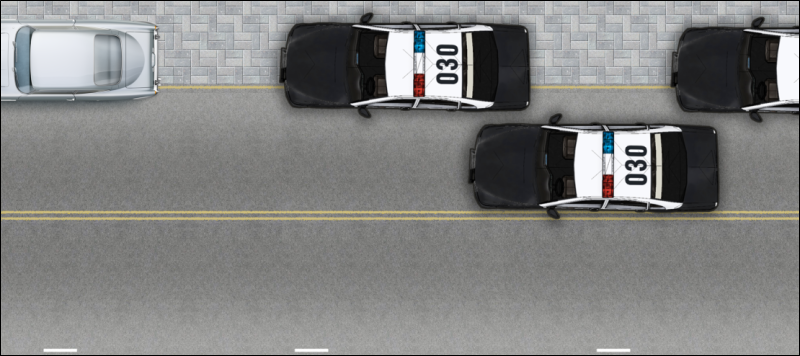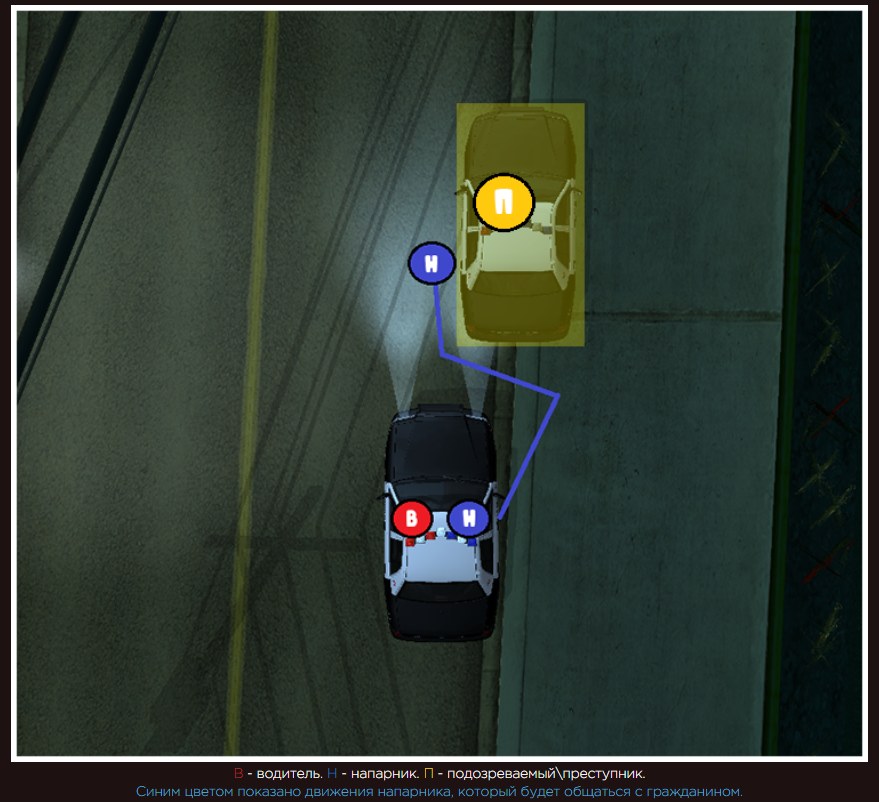 После остановки машины вы должны остановить ваш автомобиль на расстоянии минимум одного корпуса позади. Сообщите о трафик-стопе по рации, запросите помощь при необходимости. При остановке на автостраде первые три прибывшие к вам машины занимают всю свободную полосу в форме полумесяца, при остановках на обычных городских дорогах первая прибывшая машина встает под углом 15-25 градусов к машине подозреваемого. Остальные патрульные автомобили при этом формируют колонны.